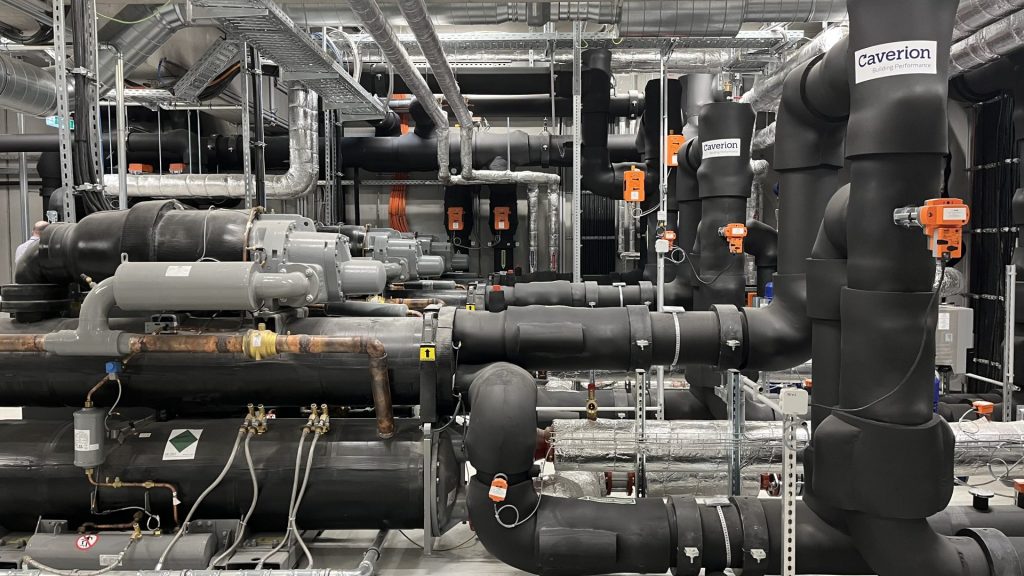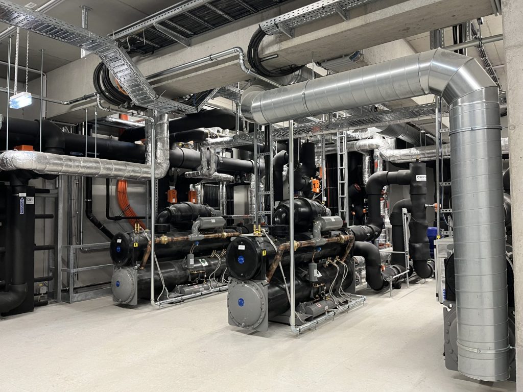 Die durch das Hochwasser 2024 beschädigte Haustechnik wurde durch eine dreigeschossige Energiezentrale ersetzt, die Trafostationen, Pufferspeicher für Warm- und Kaltwasser, drei Wärmepumpen sowie die gesamte Stromverteilung inklusive Notstromversorgung beherbergt.